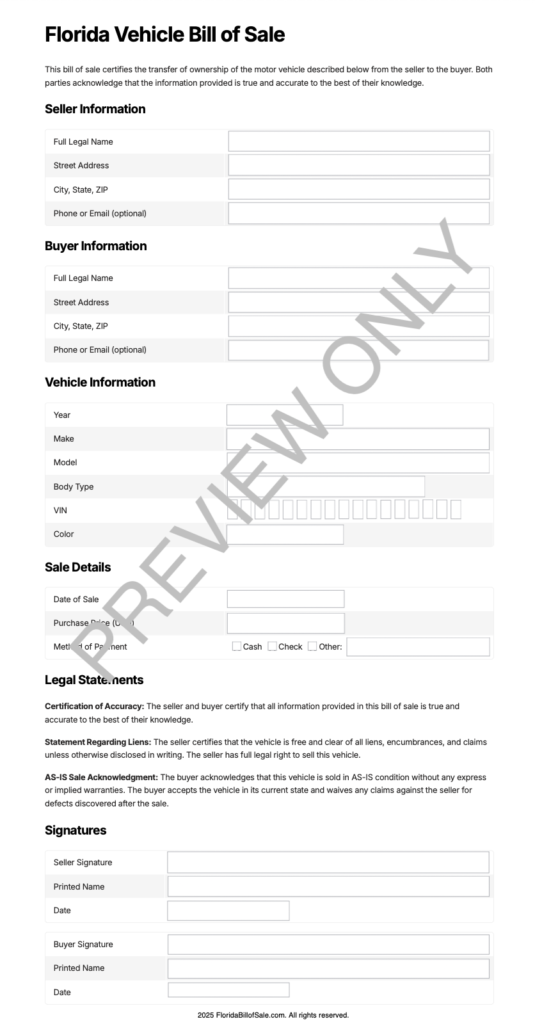 While Florida does not require a specific form, using a properly formatted bill of sale ensures you meet all Florida DMV requirements and protects both parties in the transaction.